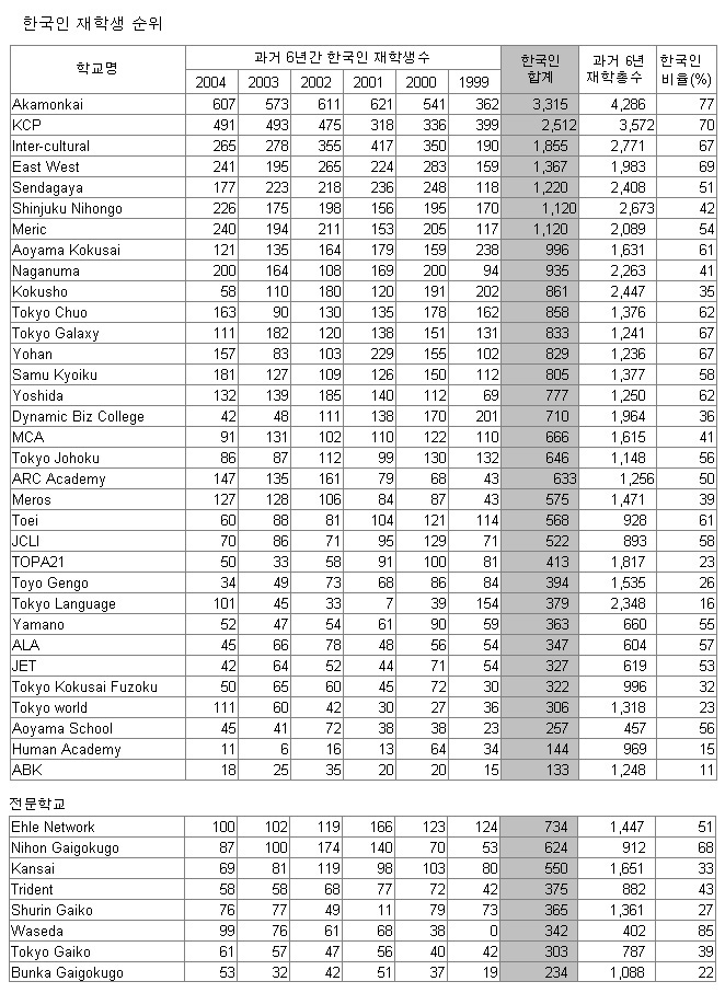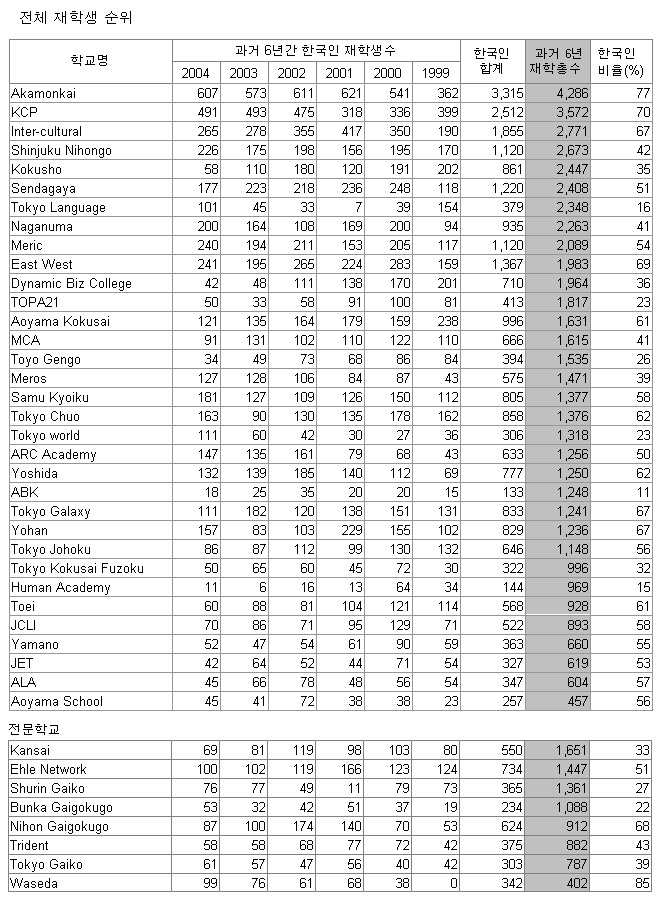 ±×¸®°í ÀÌ µ¥ÀÌÅÍ´Â 1999³âµµºÎÅÍ 2004³âµµ±îÁö 6°³³â¿¡ °ÉÃļ ¸Å³â 7¿ù1ÀÏ ÇöÀçÀÇ °¢ Çб³ÀÇ ÀçÇлý¼ö¸¦ "ÀϺ»¾î±³À°ÁøÈïÇùȸ"¿¡¼ ¾ÓÄÉÀÌÆ® Á¶»çÇÏ¿© "ÀϺ»¾î±³À°±â°üÀ϶÷"À̶ó´Â µ¥ÀÌÆ®ºÏ¿¡ °ÔÀçÇÏ¿© ¹ßÇàÇÑ ³»¿ë¿¡ ±Ù°ÅÇÑ °ÍÀÔ´Ï´Ù. ÀÌ ¼Ó¿¡´Â ´Ü±â»ýÀ̳ª ±âŸ ÇлýÀº Æ÷ÇԵǾî ÀÖÁö ¾Ê¾Ò°í ÃëÇлý, À¯Çлý ºñÀÚ¸¦ °¡Áø Á¤±Ô°úÁ¤ Çлý¸¸ Æ÷ÇÔÀÌ µÇ¾ú½À´Ï´Ù.